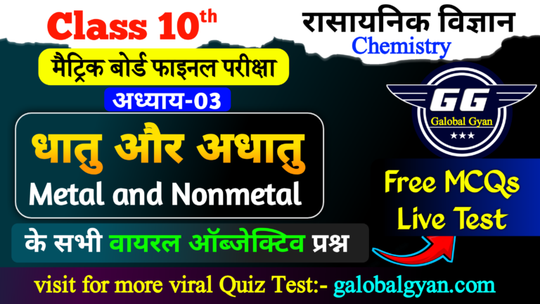 दोस्तों आने वाले कक्षा 10th के फाइनल मैट्रिक बोर्ड परीक्षा को ध्यान मे रखते हुए विज्ञान (Science) रसायन विज्ञान (Chemistry) अध्याय-03, धातु एवं अधातु (Metals and Non-Metals) QUIZ को तैयार किया गया है, ताकि इस विषय में विद्यार्थी अधिक से अधिक अंक प्राप्त कर सकें और इस QUIZ में केवल V.V.I ऑब्जेक्टिव MCQS प्रश्नों को ही शामिल किया गया है, जो आगामी(आनेवाली) फाइनल परीक्षा के लिए बहुत महत्वपूर्ण है, सभी छात्र एवं छात्राएँ विज्ञान (Science) रसायन विज्ञान (Chemistry) अध्याय-03, धातु एवं अधातु (Metals and Non-Metals) के QUIZ को ऑनलाइन MCQS Live टेस्ट दें ताकि आप बिहार मैट्रिक बोर्ड परीक्षा में धातु एवं अधातु (Metals and Non-Metals) चैप्टर-03 से 100% अंक प्राप्त करें !